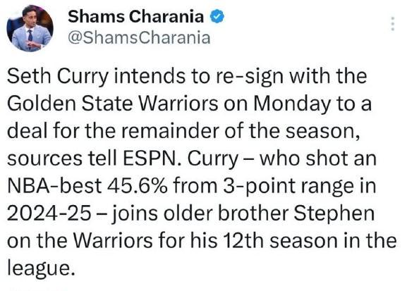 Shams:塞斯-库里计划与周一与勇士签约至赛季结束